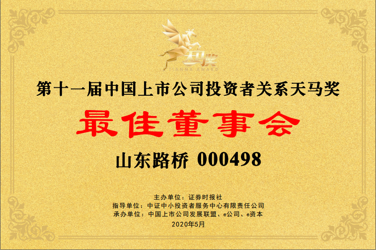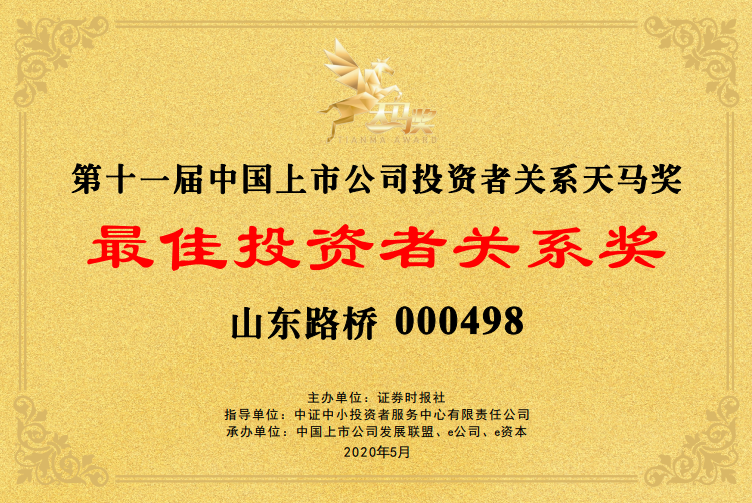 5月13日,由证券时报主办,中证中小投资者服务中心有限责任公司担任指导单位的“第十一届中国上市公司投资者关系天马奖”榜单发布。山东路桥获评“最佳投资者关系奖”“最佳董事会奖”。