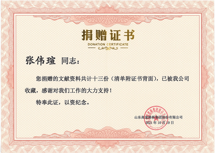 此次捐赠的文献资料共13件,内有照片、瓷器、报刊、印刷品等,时间跨度从1953年到2010年,涵盖了华东公路局第三工程总队、山东省交通厅公路局第二工程大队干部合影,平阴黄河大桥、济南黄河公路大桥通车纪念品和新闻报道,填补了公司发展史的资料空白。