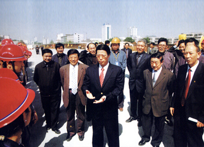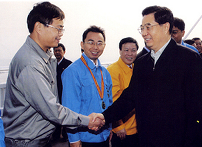 原中共中央总书记、国家主席、中央军委主席胡锦涛2005年10月视察南京长江三桥建设并亲切接见集团公司干部职工。